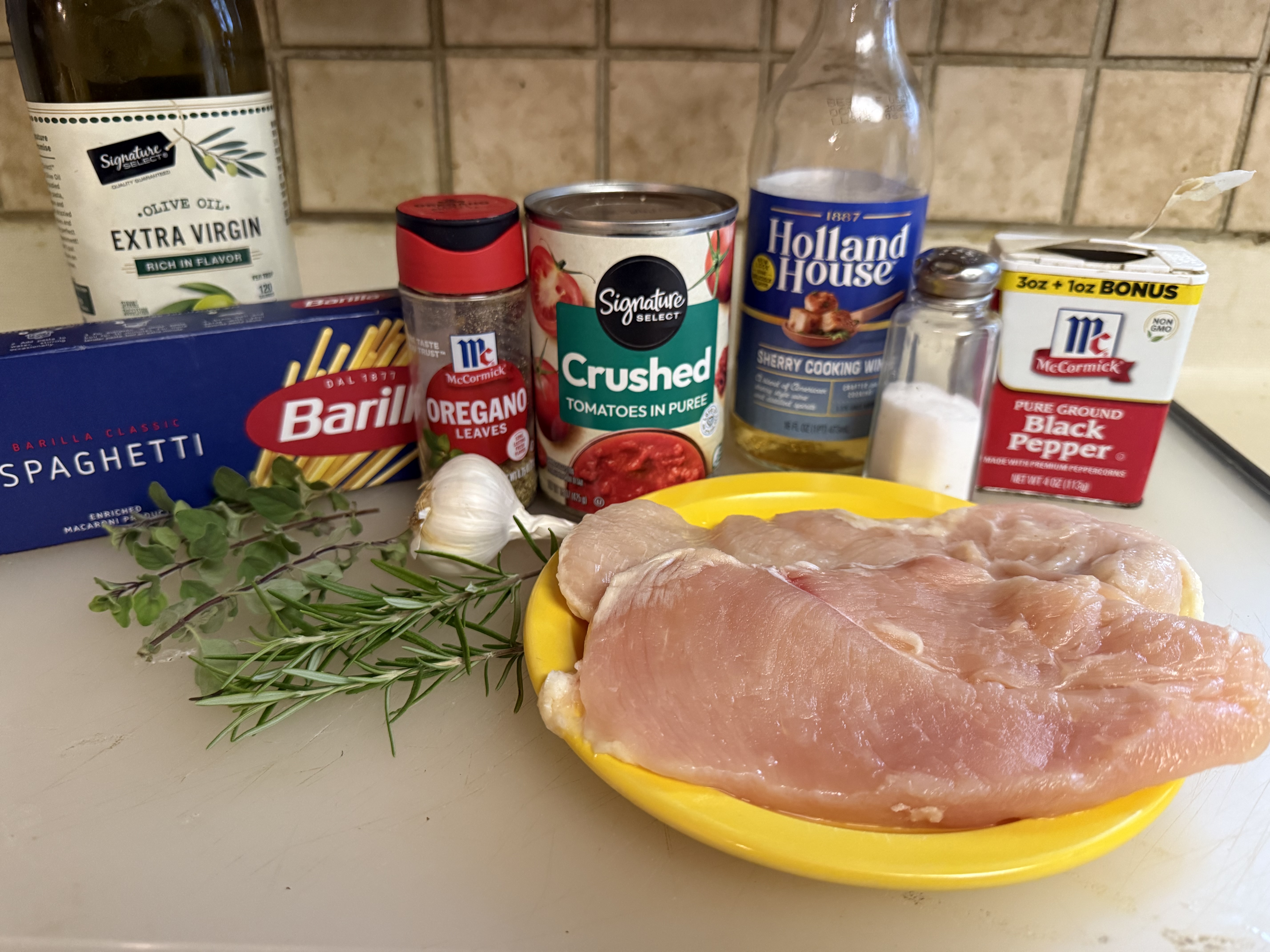 “Chicken Cacciatore” was requested from a reader in Metairie had lost her copy of the recipe, prompting her to request it in the Times-Picayune column. The recipe, from Mary Jo and Johnny of the Mosca’s, was originally included in another cookbook published on 2003. It appears to me that the recipe needs a little “tweaking.” Hence, I am using the recipe as a guide with my own modifications. For example, I used two boneless chicken breast cutlets rather than a whole, cut up chicken. (A whole, cut-up chicken would be delicious here, and would add lots of flavor to the dish. Substitute if desired. Today, I’m going for simplicity.) I used sherry cooking wine rather then dry cooking white wine. I used fresh rosemary and oregano rather then the dried herbs. Yes, a great use for some of the herbs growing in my container garden. The crushed tomatoes and garlic are the same as is the original recipe.