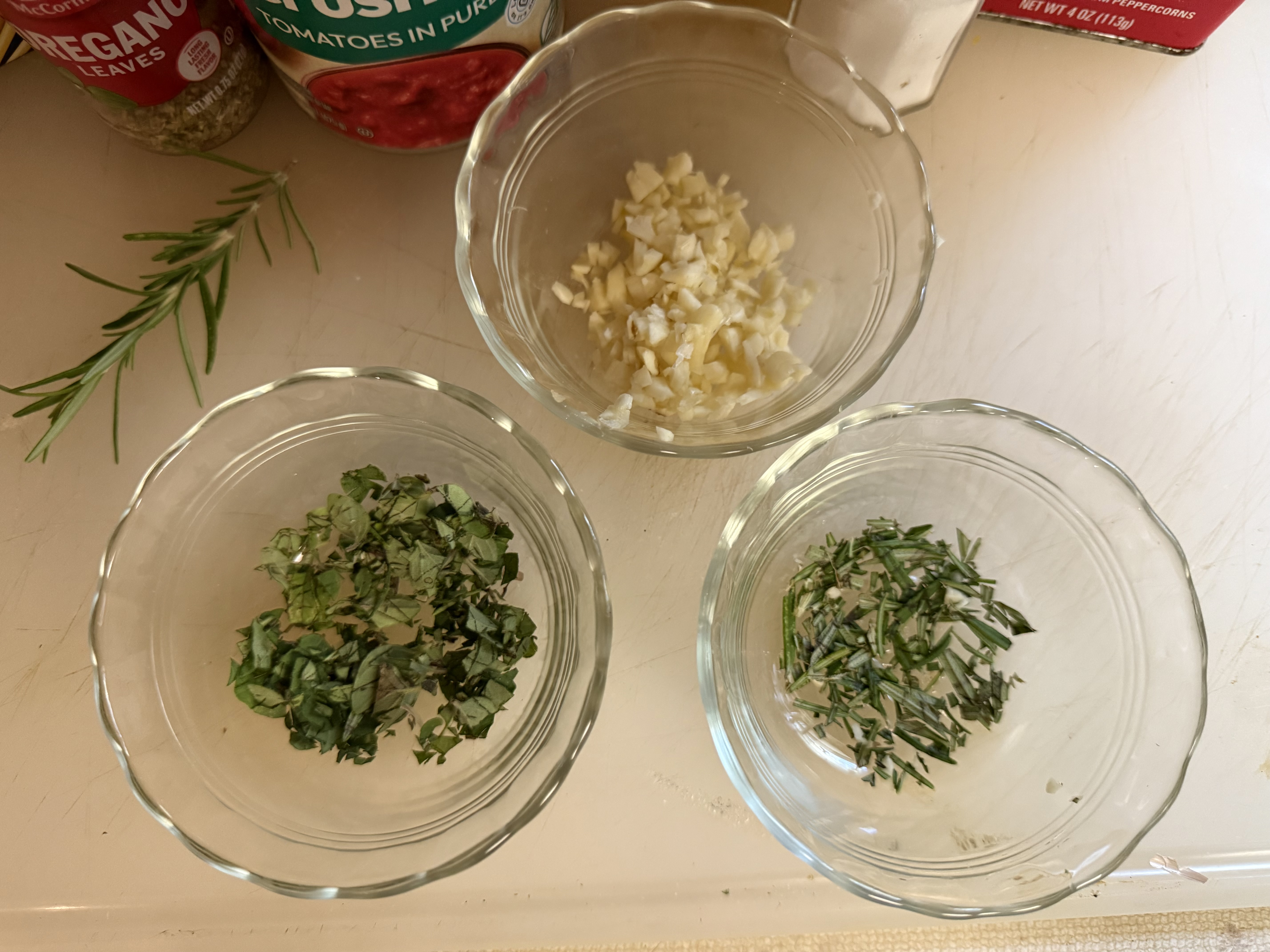 To get ready, mince the garlic, fresh rosemary and oregano. The fresh herbs give a great flavor “pop.” Although this seems like alot of garlic; that amount is typical of the the Mosca family recipes. Interestingly, rosemary is included in a number of the dishes served in the Mosca’s restaurant. That’s great; as rosemary grows so well in my garden.