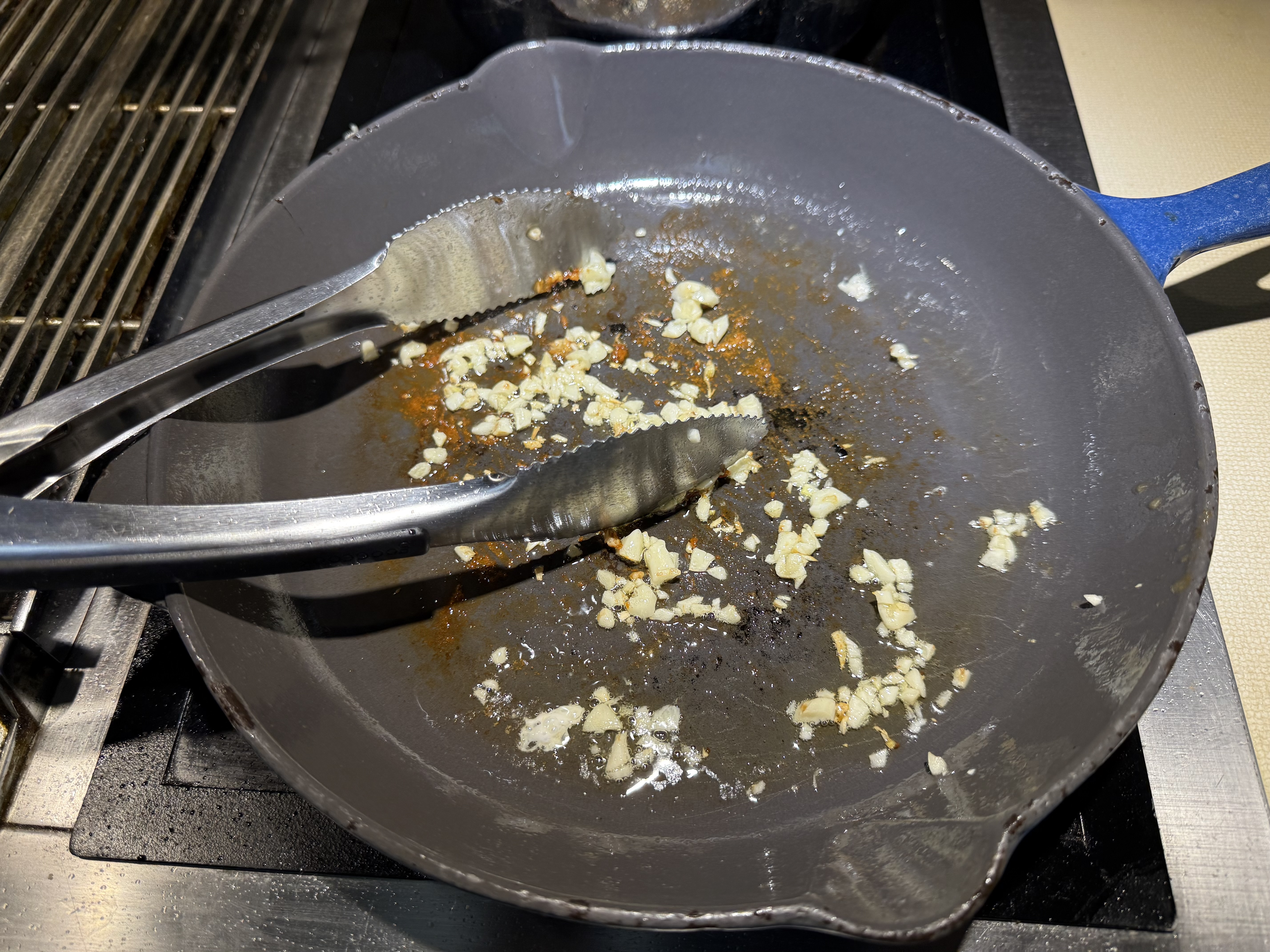 - Reduce heat to medium. Add remaining 1 Tbsp oil to skillet. Add the minced garlic. Stir and cook until aromatic.