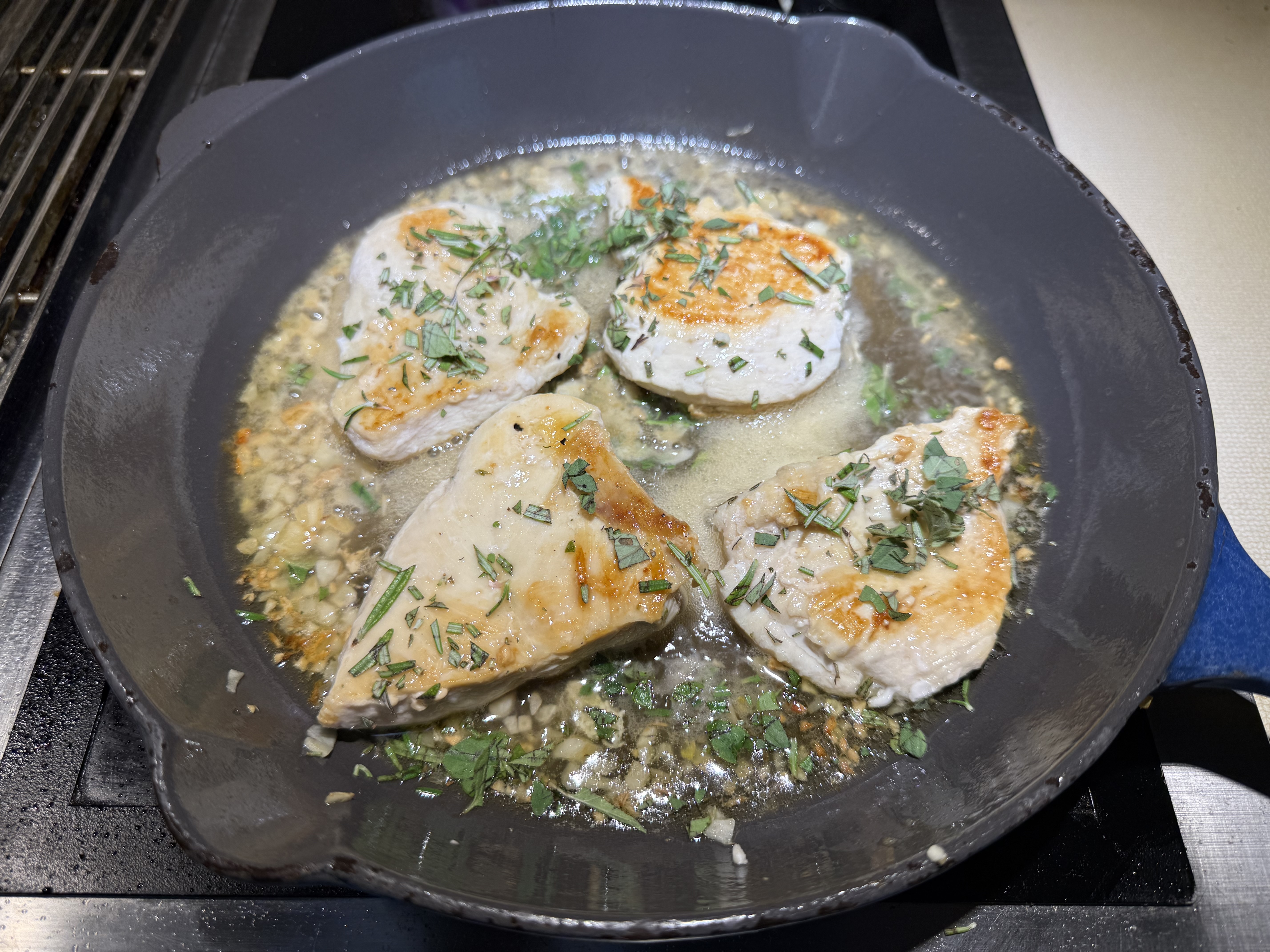 - Return the chicken to the skillet. Sprinkle with the minced fresh (or dried) herbs.