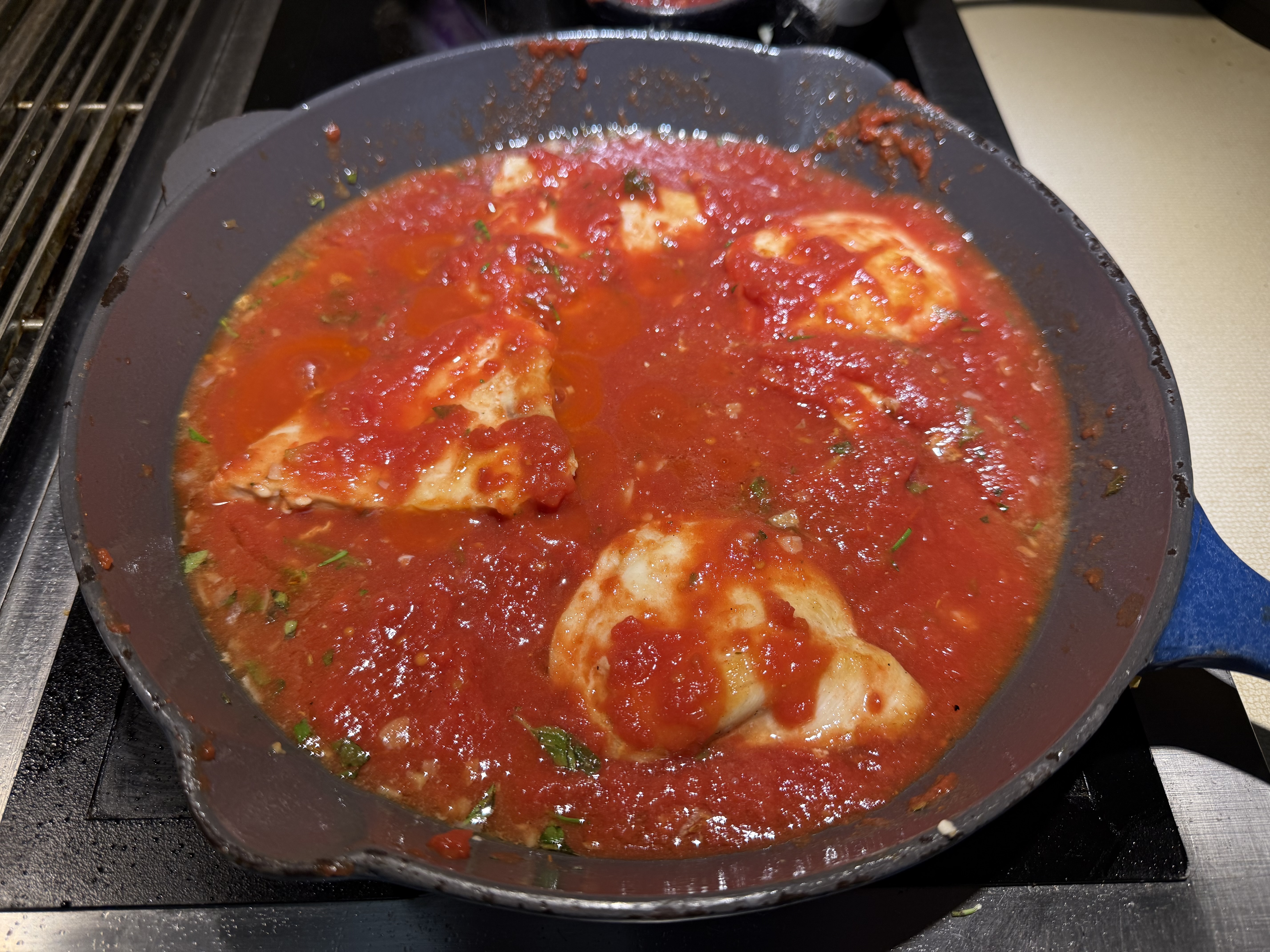 Remove the chicken to a plate while you sauté the minced garlic until aromatic over medium heat (just a minute or less). Return the chicken to the skillet. Add the wine. (Do this off the burner — it will splatter). Add the fresh herbs. Mix in the crushed tomatoes.
