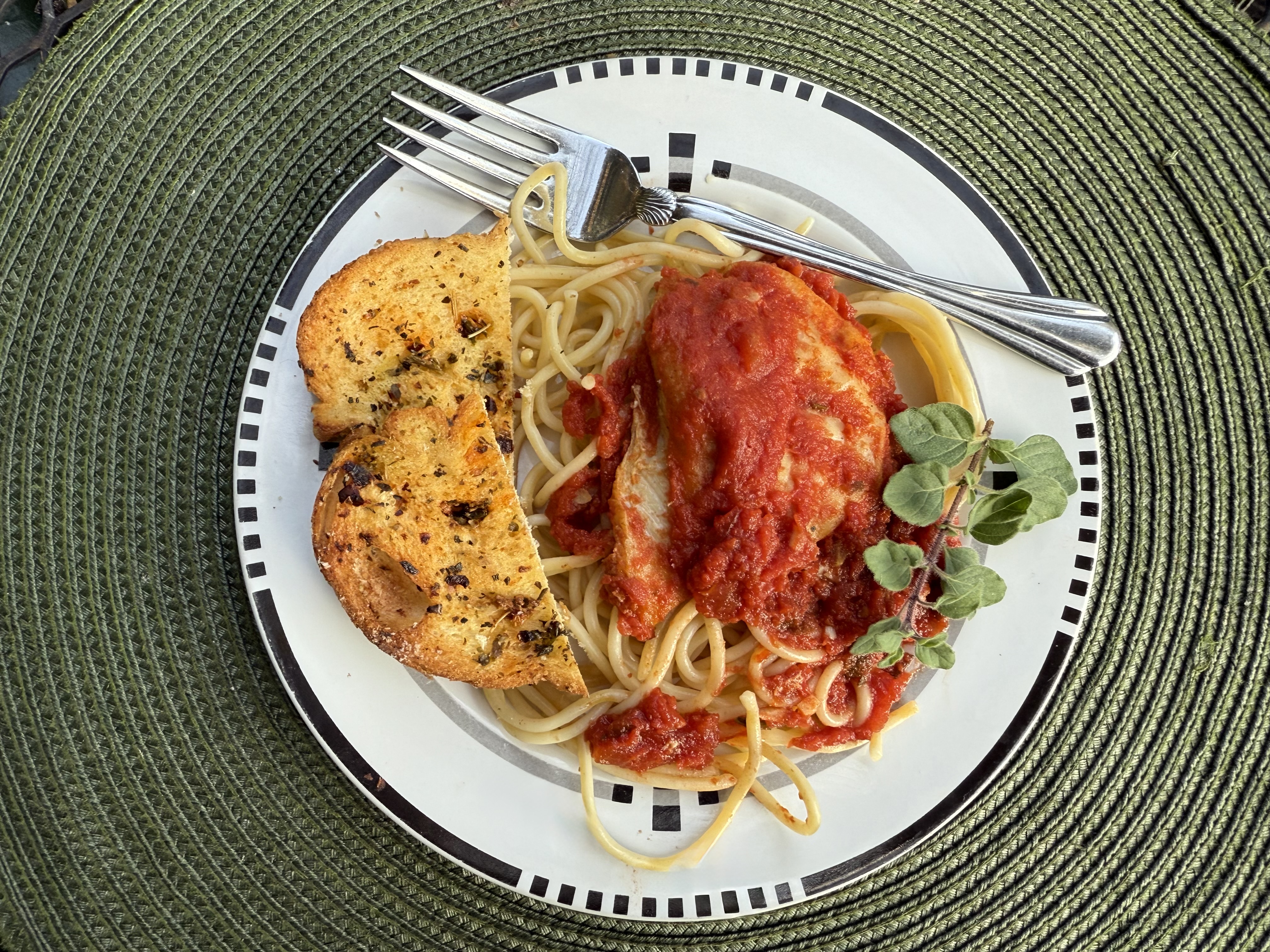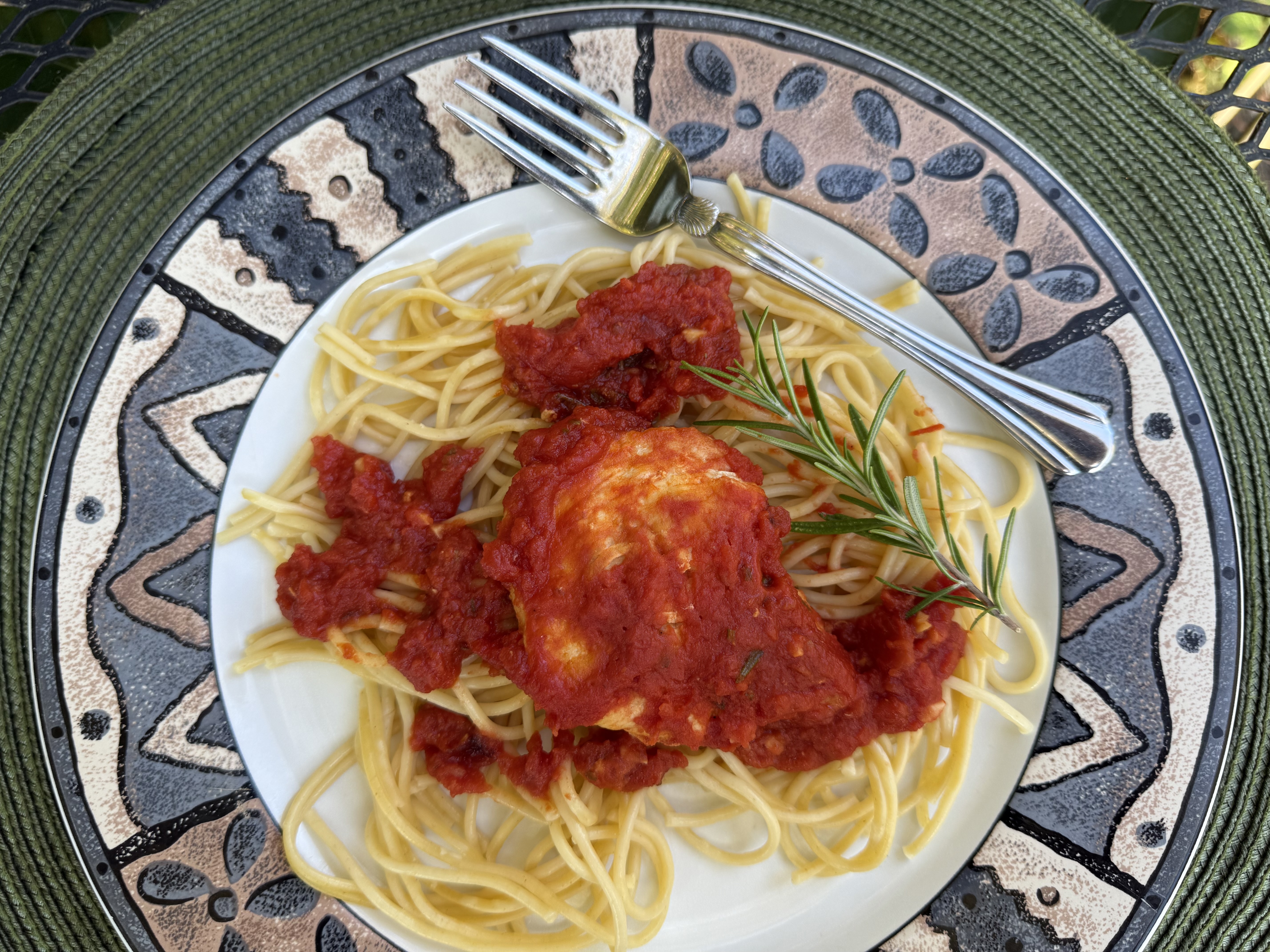 Partially cover and let the chicken bubble and simmer away for about 30 minutes until the chicken is tender. The flavors of the herbs and white wine blend in making an absolutely delicious tomato sauce. I did find it necessary to add additional water — as the tomatoes were beginning to stick.