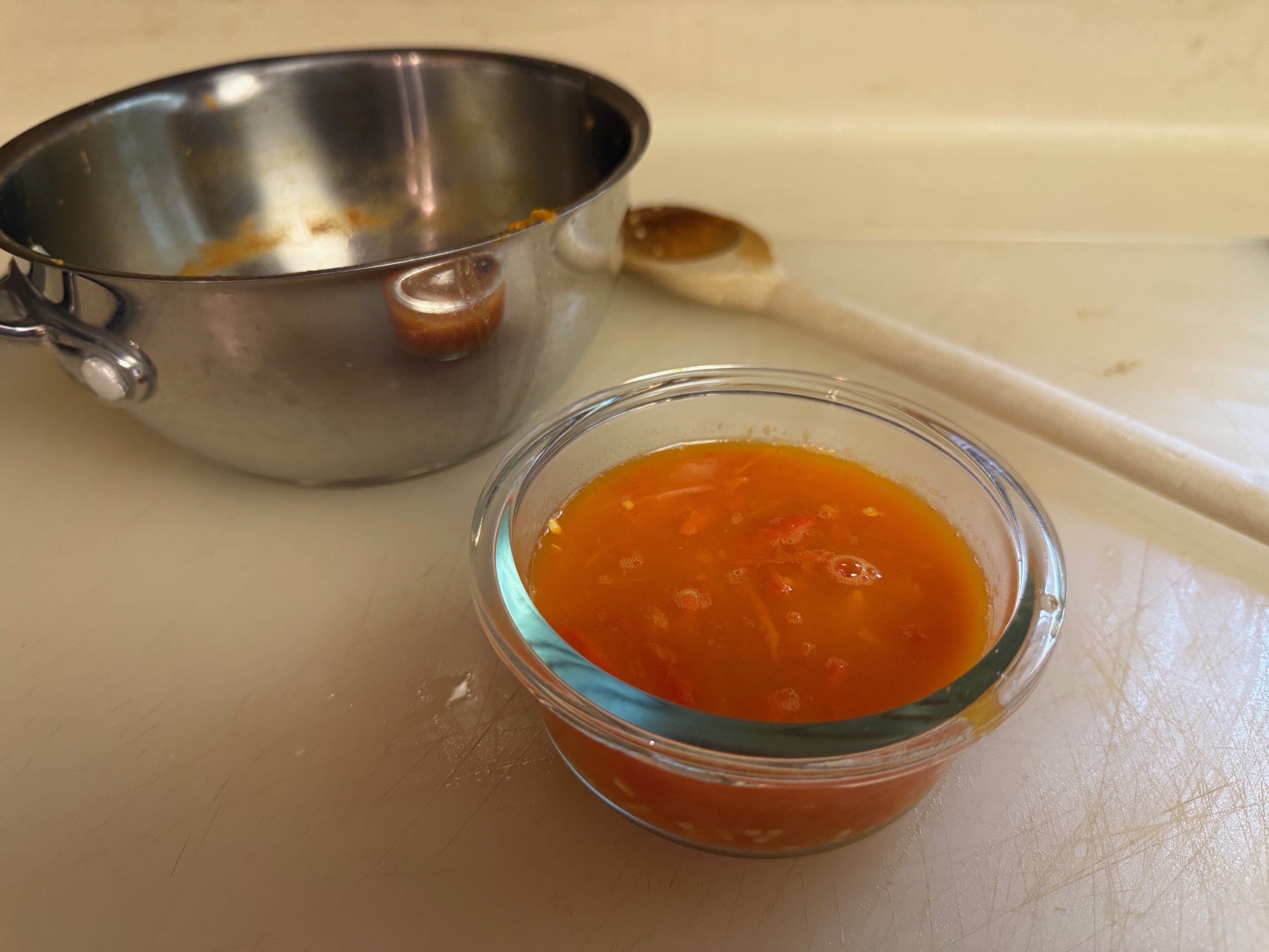 - Transfer the sauce into a sterilized jar. (Sterilize the jar by boiling jar and lid in water for five minutes.)