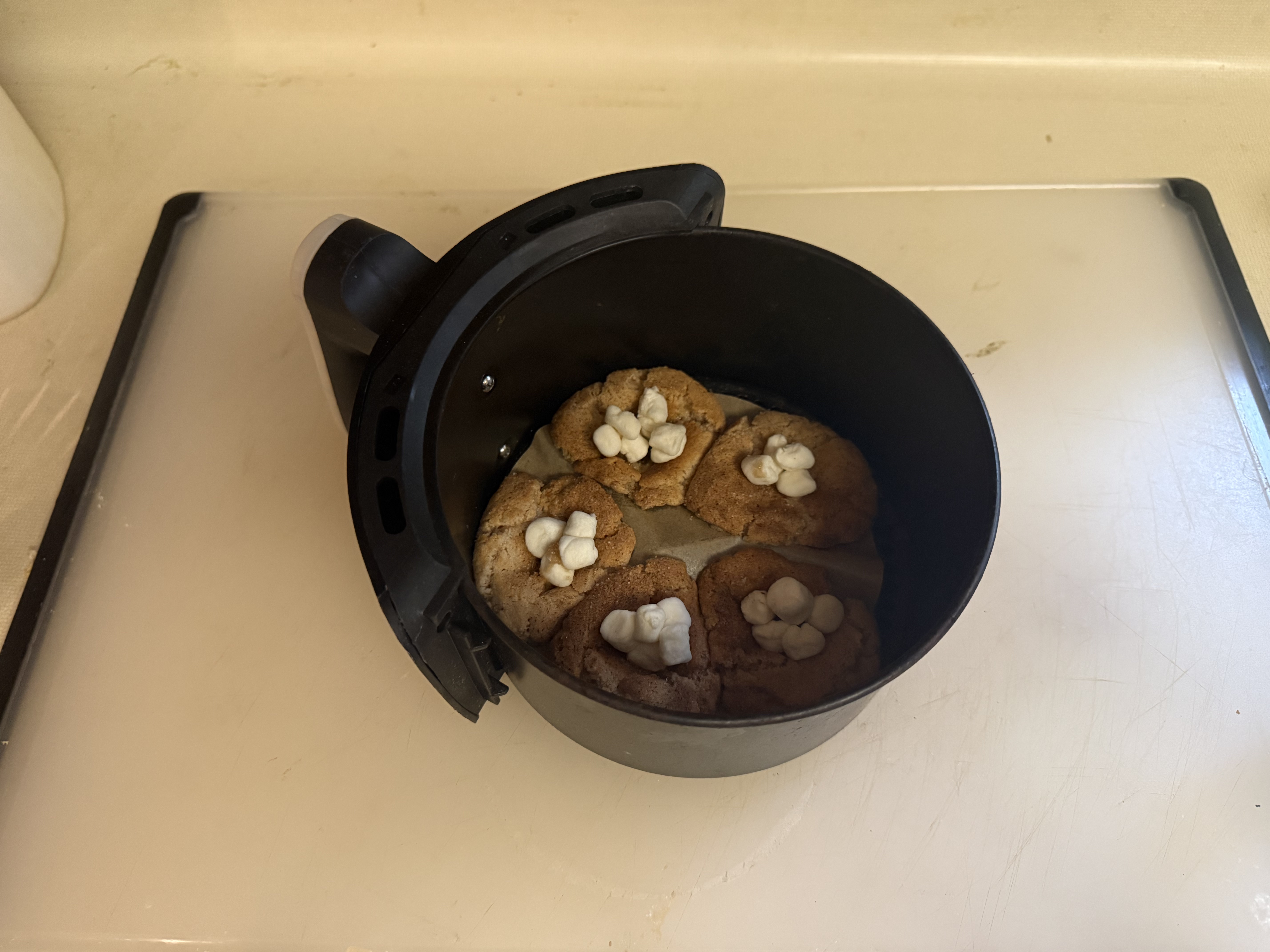 To make these cookies special, I added marshmallows when the cookies were partially baked. (This was 5 minutes.) The cookies will puff up. Make an indentation into each cookie with the back of a spoon. Press in several mini-marshmallows and bake until the marshmallows toast. (Don’t burn the marshmallows!) Use tongs to grab the center knob of the grate and lift the cookies out of the basket.