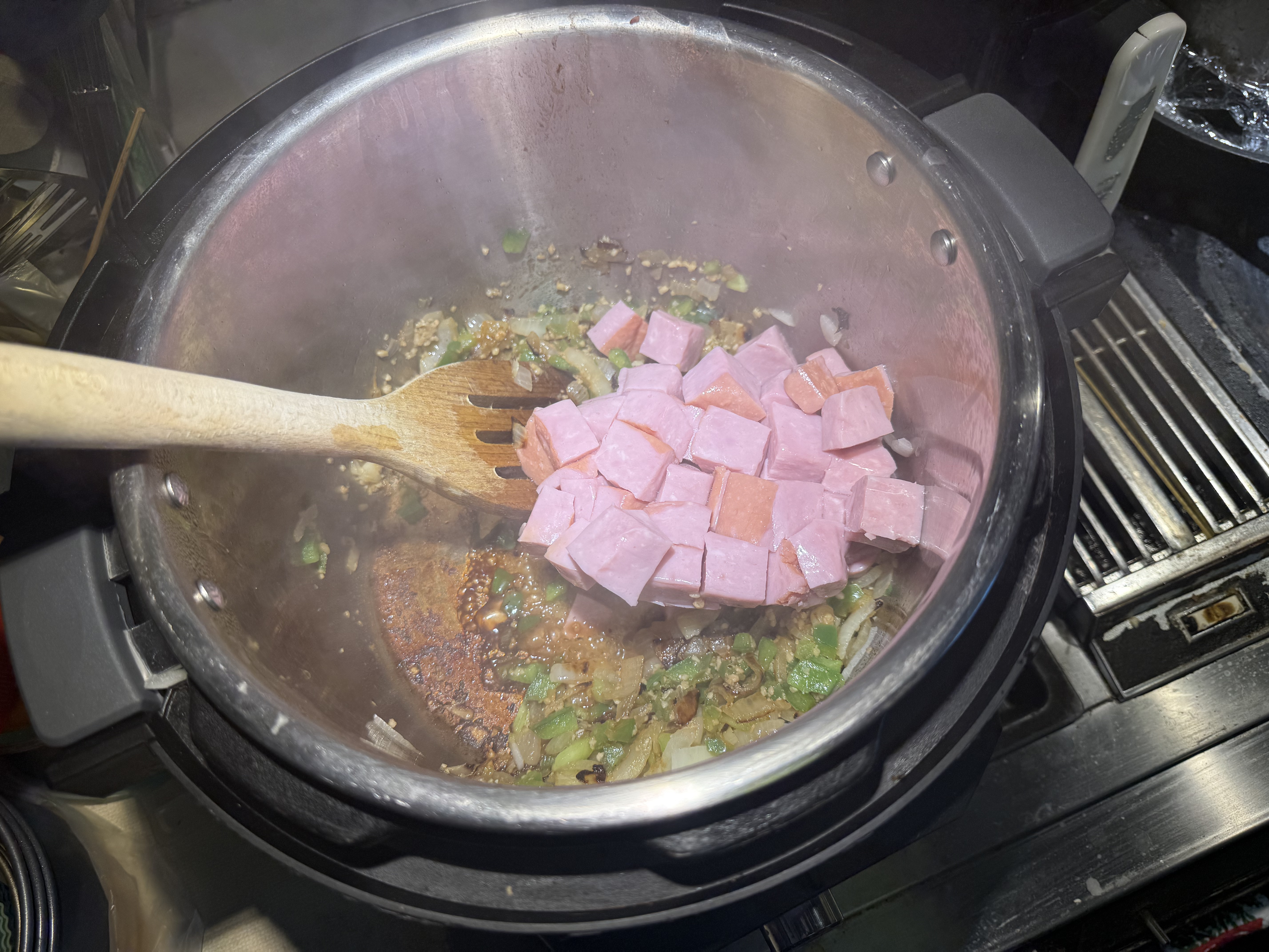 The next step is to saute and cook the chopped onion and bell pepper until soft and translucent. Then I added the ham and seared it, too.